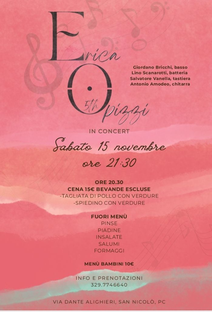 a San Nicolò, sabato 15 novembre serata Aut Side Bar (annesso al Centro Culturale) con “Erica Opizi e la sua band”. Per info e prenotazioni 329 7746640