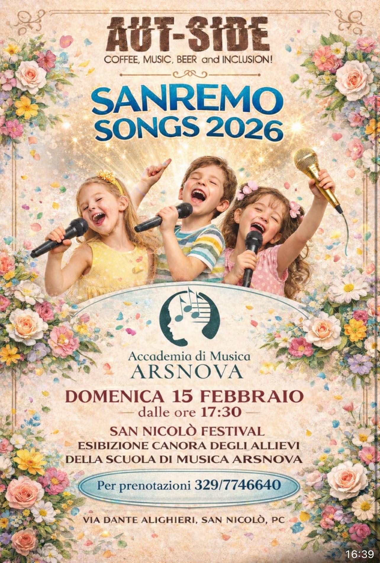 Domenica 15 febbraio ore 17.30 presso Aut-Side bar (annesso al Centro Culturale) esibizione canora degli allievi della scuola di musica Arsnova con l’evento “Sanremo Songs 2026”